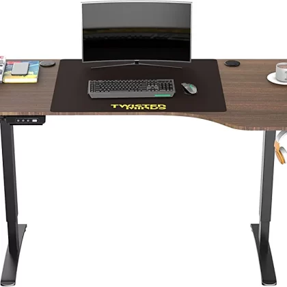 Electric height-adjustable T-shaped gaming desk for right-handed PC gamers, made of walnut wood. |