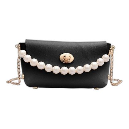Black Crossbody Bag with Faux Pearl Beads and Chain for Women's Fashion. |