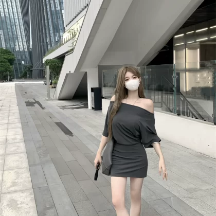 Dark gray hottie slanted shoulder summer short-sleeved dress |
