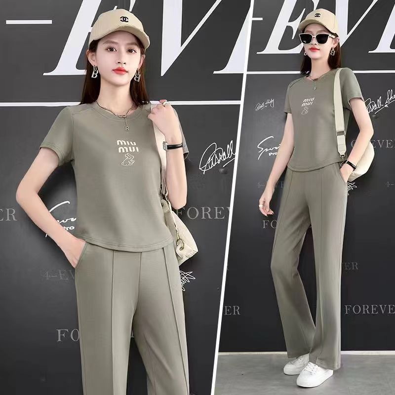 Ice Silk Sports Suit Women’s Chubby Girl Summer New High-end Fashion Western Style Comfortable Casual Running Short-sleeved Wide-leg Pants