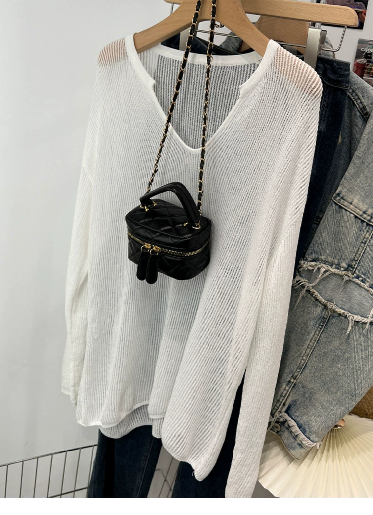 Pure color thin sunscreen shirt female Korean version 2024 summer new loose V -neck long sleeve hollow hollow tempera