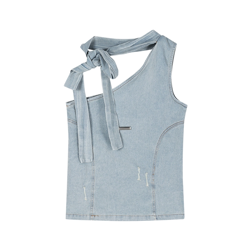 Light blue denim slope collar one-shoulder retro tight vest
