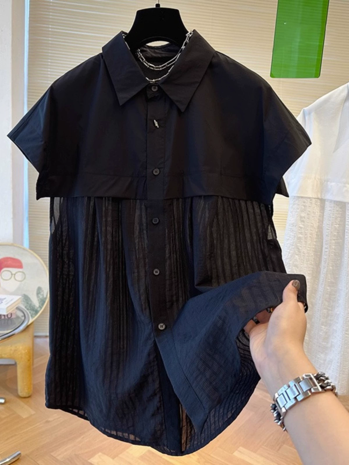 High -end hem chiffon stitching short -sleeved loose shirt