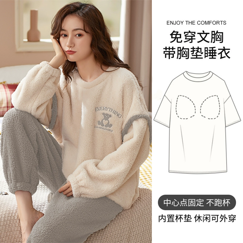 Coral velvet pajamas autumn and winter women’s chest pad 2024 new style warm and velvet thick flange home service