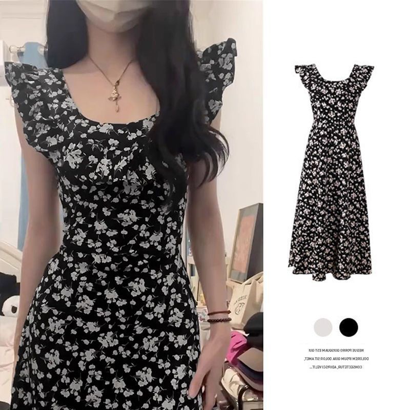 Lady Rose Peninsula French Style Black Floral dress Women’s Summer Fly-sleeved Elegant Slim-fit Backless Long Skirt