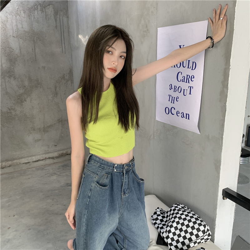 Knitted suspender vest for women in summer, short vest, inner layer, hot girl sleeveless green top spring and autumn