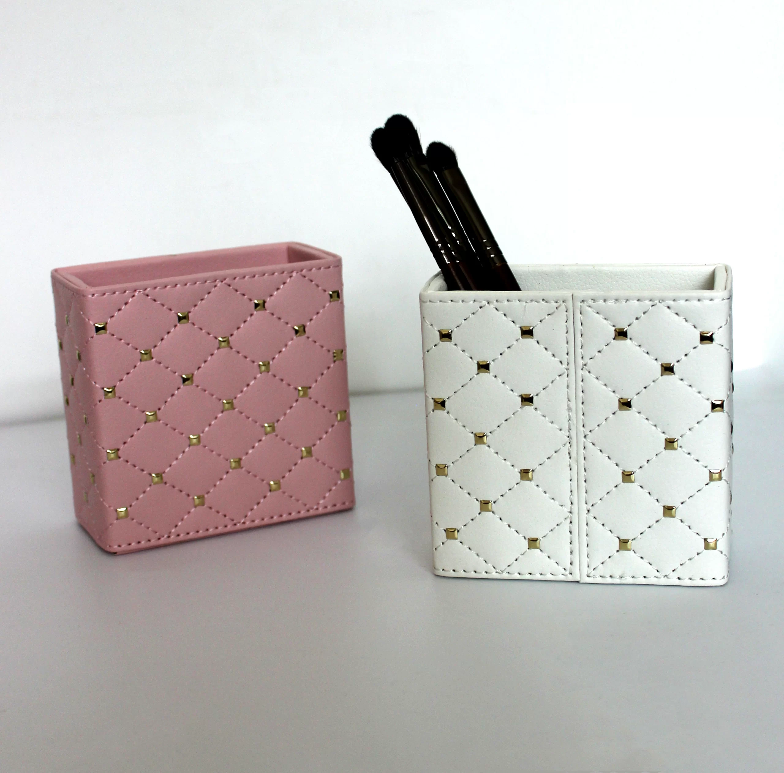 Square PU leather makeup brush holder storage box pink and white portable makeup box pen holder with makeup artist protection