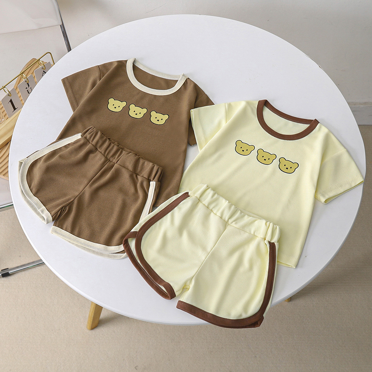 New summer children’s waffle short sleeve rounded pants suit short three bear head refreshing and transparent