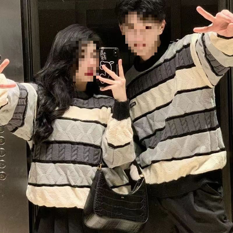 Couple’s Autumn and Winter American Retro Striped Blue Grey Casual Shirt Design Sense Thickened Lazy Style Comfortable Sweater