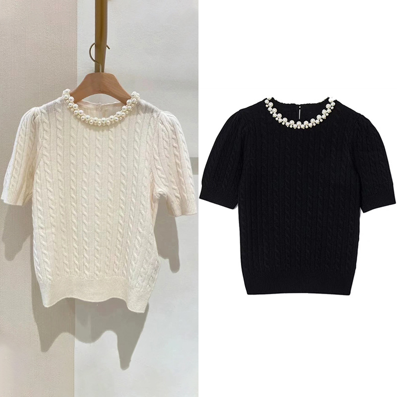 French style niche 2024 spring and summer handmade pearl trim collar puff sleeve twisted waist round neck sweater 24031