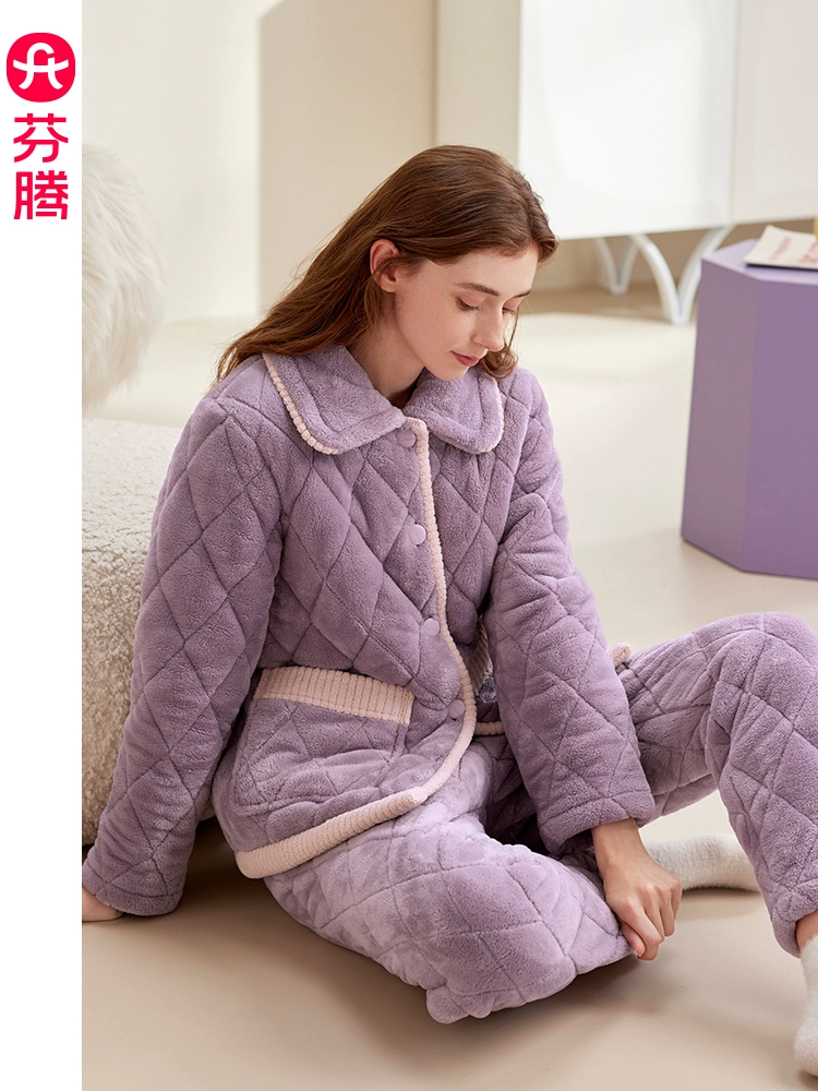 Fenton anti-static quilted pajamas for women winter three-layer thickened plus velvet cotton jacket winter coral velvet home wear set