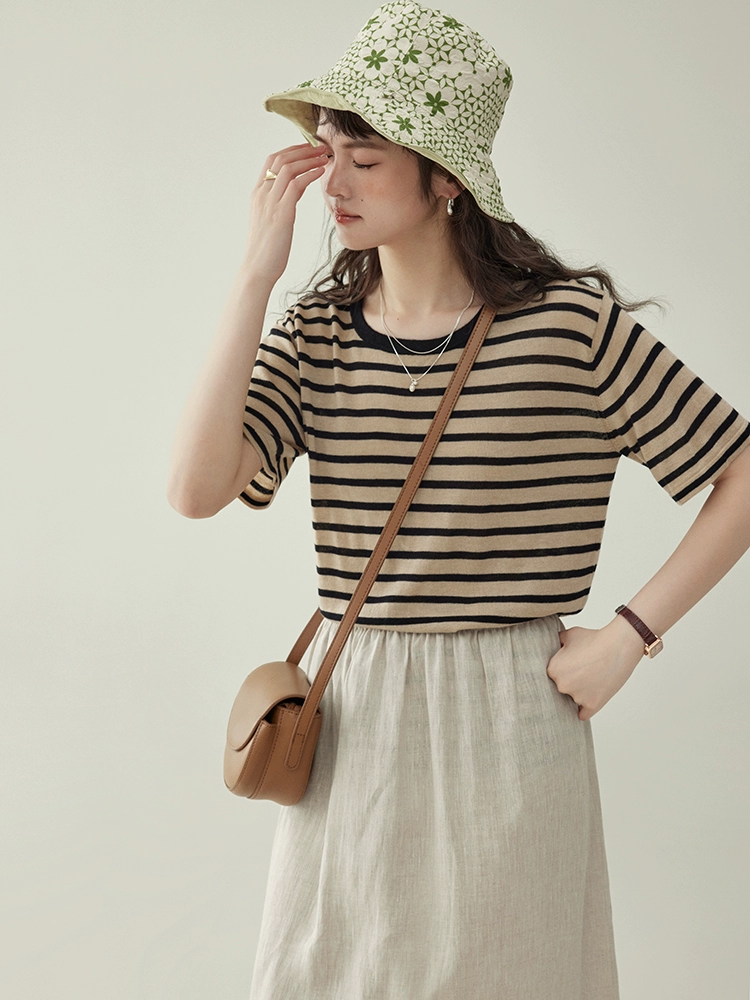 AMUU round neck contrast stripes loose casual short sleeves