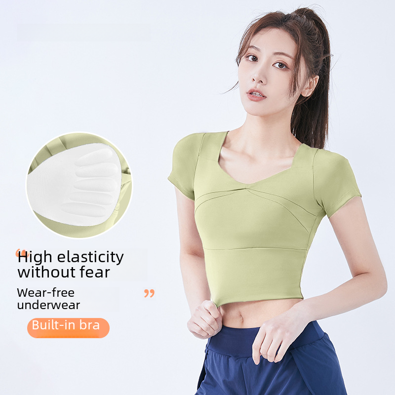Juyitang Summer Short Women’s Sports Top Quick-drying with Chest Pad Running Tight Naked Fitness Yoga Short Sleeves