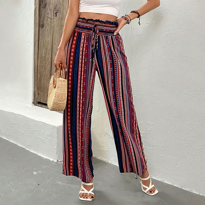 Foreign Trade New Ethnic Style Pants Loose Comfortable High Waist Wide Leg Pants Staggy Waist Contrast Straight Pants Women’s Pants