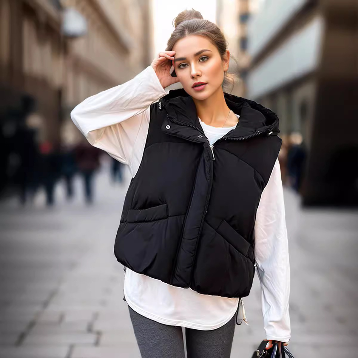 Labelable TEMU European Large Pocket Down Cotton Vest Women’s Short A- line Hooded Casual Warm Jacket