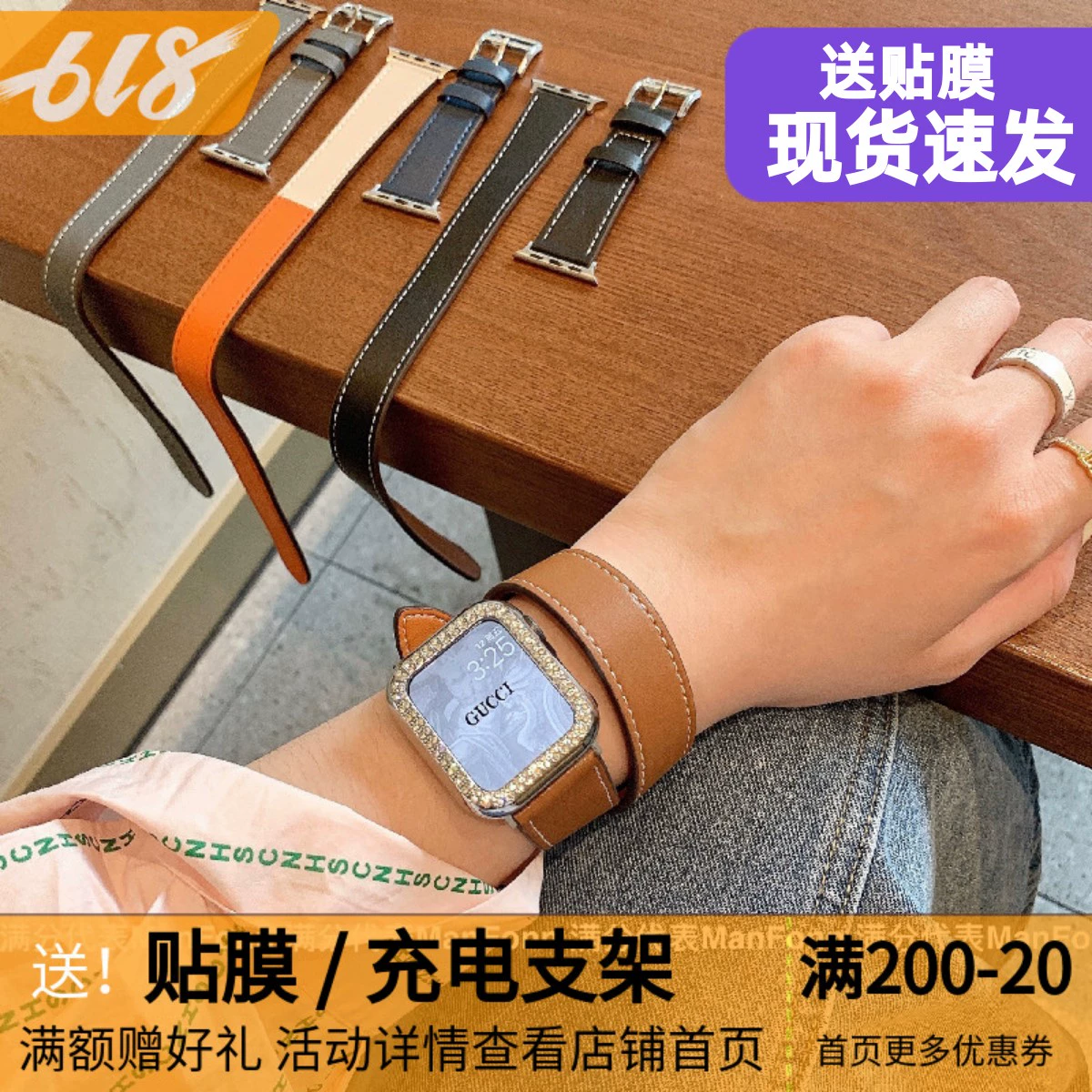 Temperament big brand suitable for Apple 98345 generation watch strap genuine leather simple double circle iwatch76 wristband SE trendy