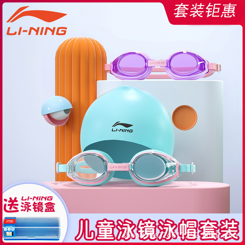 Li Ning children’s swimming goggles girls boys swimming glasses waterproof anti-fog HD diving professional equipment swimming cap set