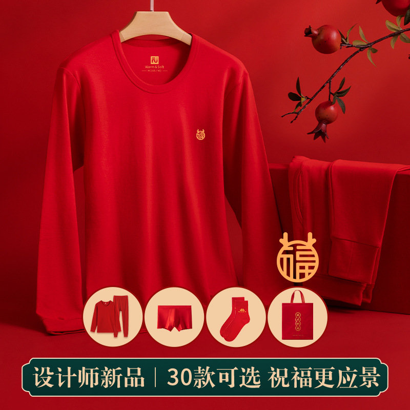2024 Men’s Natural Year Cotton Suit for the Middle-aged and Elderly Cotton Thermal Underwear Thin Women’s Red Autumn Clothes and Pants