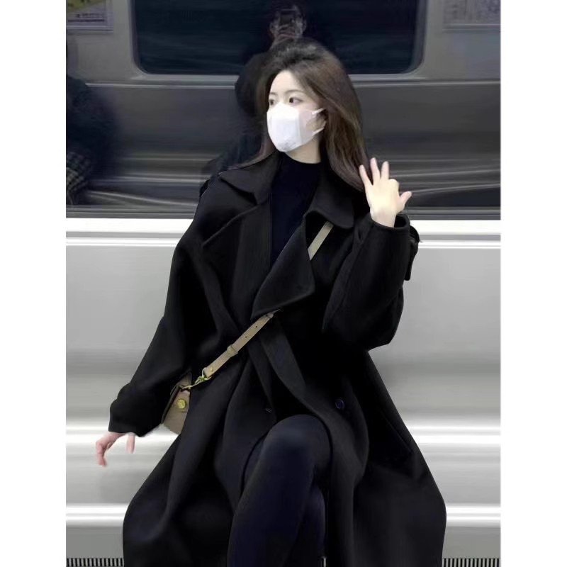 Black woolen coat for women Spring and Autumn New style mid-length thickened suit collar woolen coat