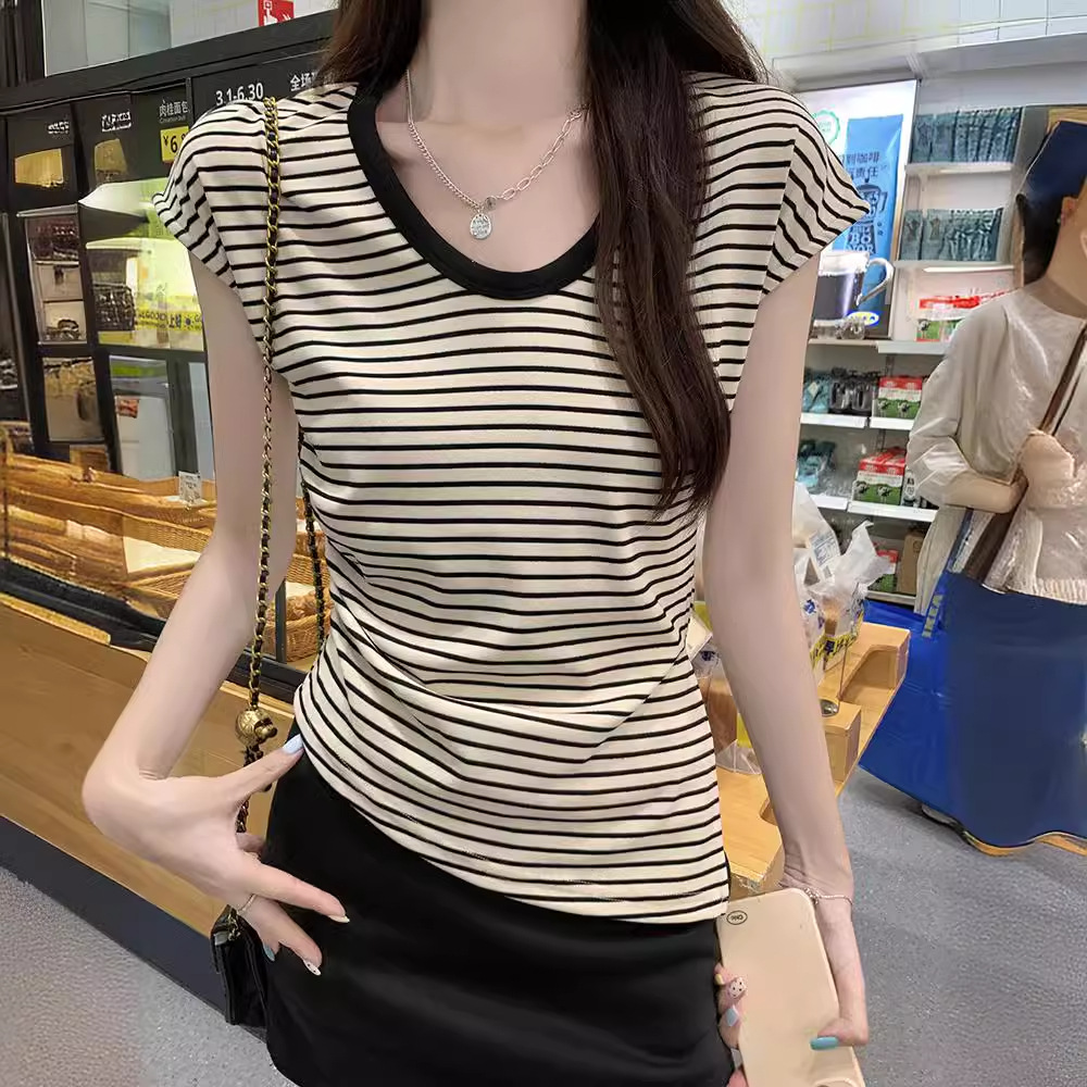 Hong Kong Style Retro Chic Striped Contrast Color Round Neck Short-sleeved T-shirt Women’s 2024 New Summer Design Niche Top