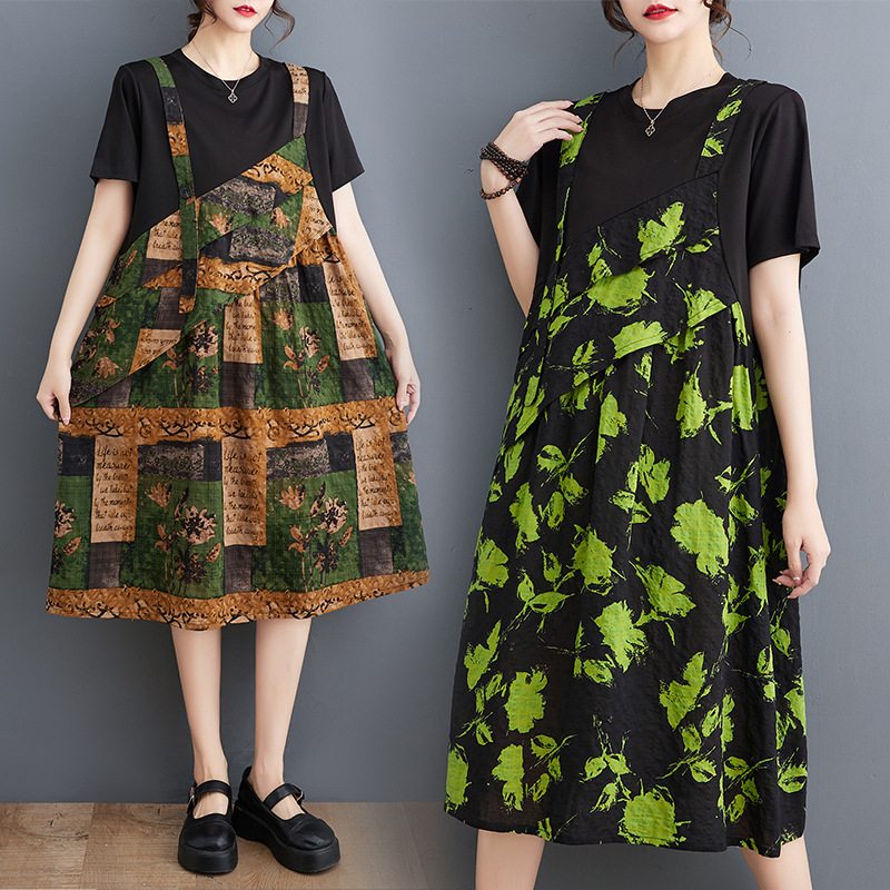 Real shot 2023 Summer new chubby girl fashion stitching loose casual western style age-reducing plus size strap dress