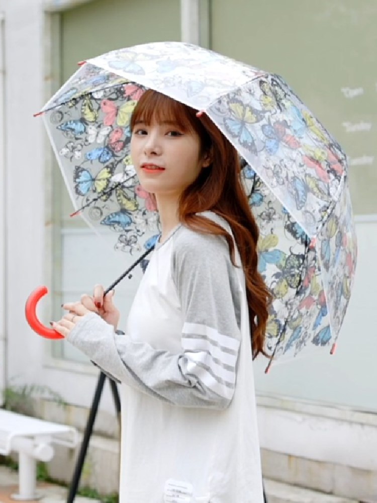 61K3 arch retro transparent umbrella female butterfly printing Mushroom umbrella curved handle long handle umbrella semi-automatic straight rod umbrella