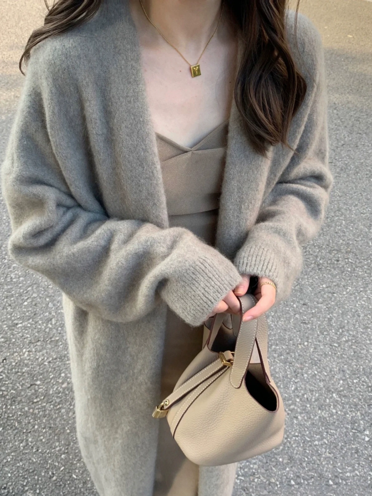 Lazy little incense wind over the knee mid -length knitted sweater women’s loose, sweet, soft, gentle, pure color sweater jacket