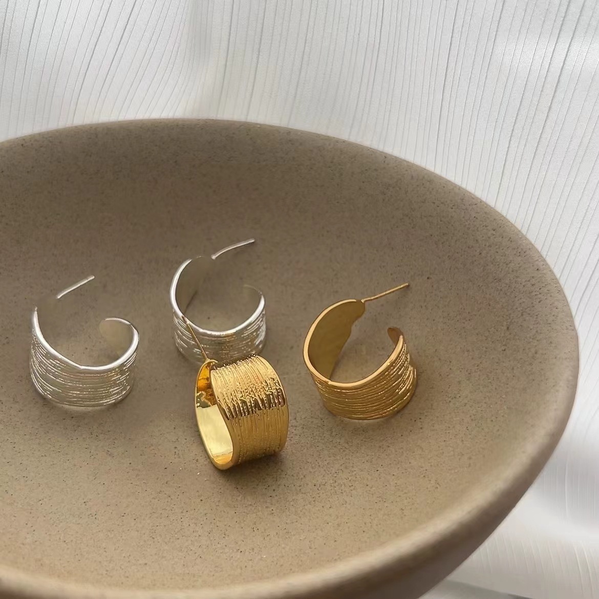 Wide Face Texture Bend Heavy Industry Old Fashion Distinctive Earrings European and American Retro Gold Hoop Earrings Women’s High Sense