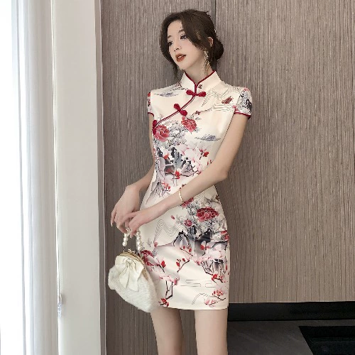 Retro Printed Republic of China Style Slim Improved Cheongsam Skirt Women’s Summer Stand Collar Short Sleeve Hip Skirt Dress Short Skirt