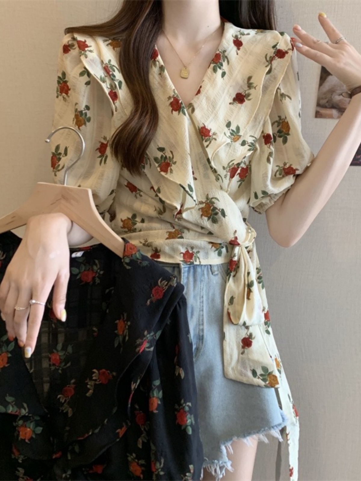 French fat girl covers the flesh and looks slimming, ruffled short-sleeved shirt