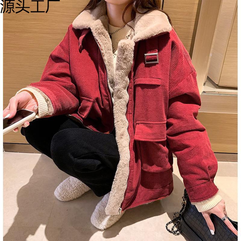 Thickened lamb wool coat women’s winter furry cotton-padded coat chubby girl plus size loose gentle style cotton-padded coat ins