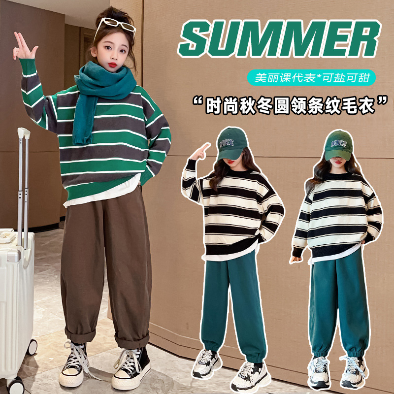 Girls’ spring and autumn wide striped knitted pullover sweater 2023 new medium and big children fashionable bottoming shirt autumn
