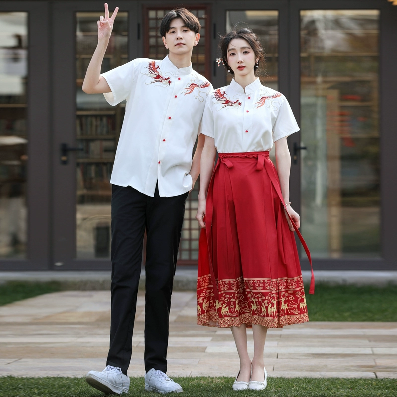 National style short-sleeved Tang suit for men and women, improved Hanfu, red horse face skirt suit, new Chinese style couple performance photo class uniform