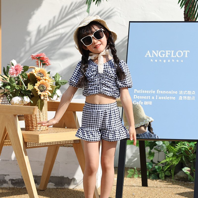 2024 New Children’s Swimwear Girls’ Korean Style Cute Casual Split Swimwear with Swimwear Cap Plaid Swimsuit