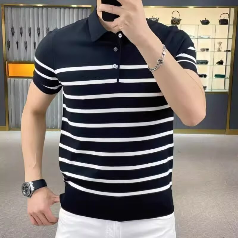 Lightly Mature Men’s Ice Silk Short-sleeved Polo Shirt Knitted T-shirt 2024 New Summer Personality Striped Lassel Trend