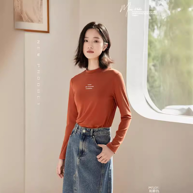 2024 Autumn and Winter New Korean Style Half-turtleneck Long-sleeved Women’s Base Shirt with Letter