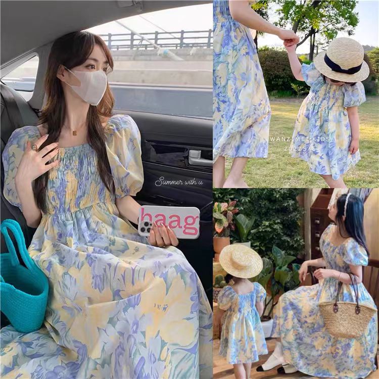Seaside Vacation Mother and Dresses dress 2024 Summer New Short-sleeved Family of Three Parent-child Shirt Floral Dress