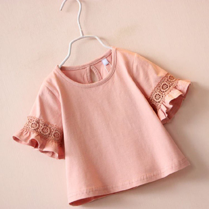 Women’s Children’s Lace Round Neck Trumpet Sleeve Short-sleeved Shirt Solid Color Top Summer New Korean Cotton