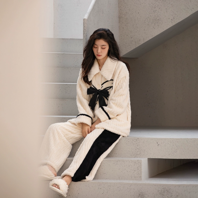 Coral velvet pajamas for women winter 2024 new style bow embroidered contrasting color can be worn outside thickened and velvet home clothes
