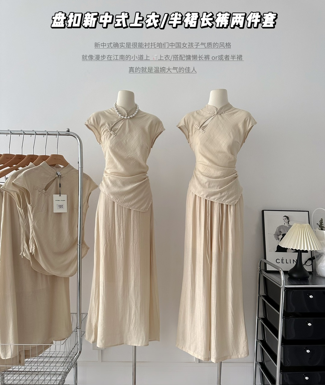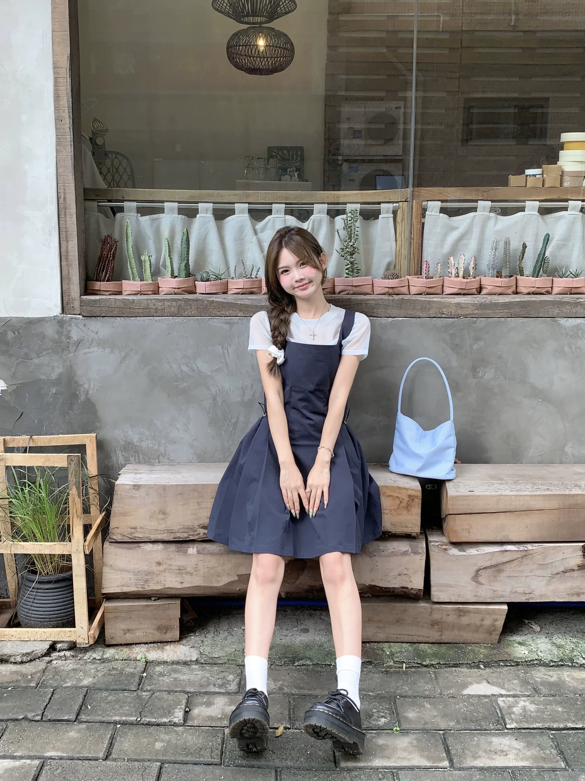 Age-reducing girlish pleated suspender two-piece short-sleeved set