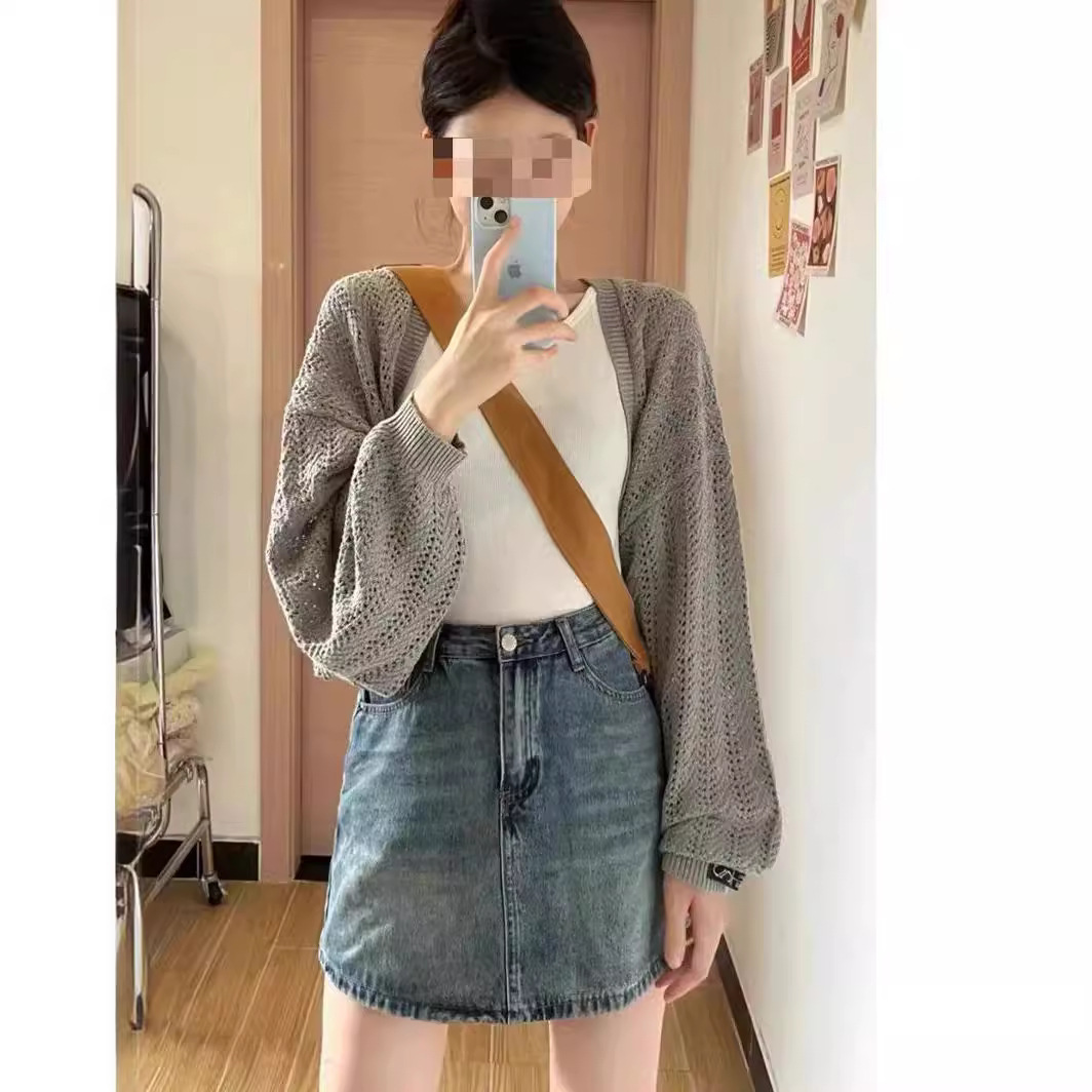 Korean Style Hollow Knitted Sweater Cardigan Blouse Women’s 24 Years Summer Elegant Grey Loose Sunscreen Shawl Coat Top