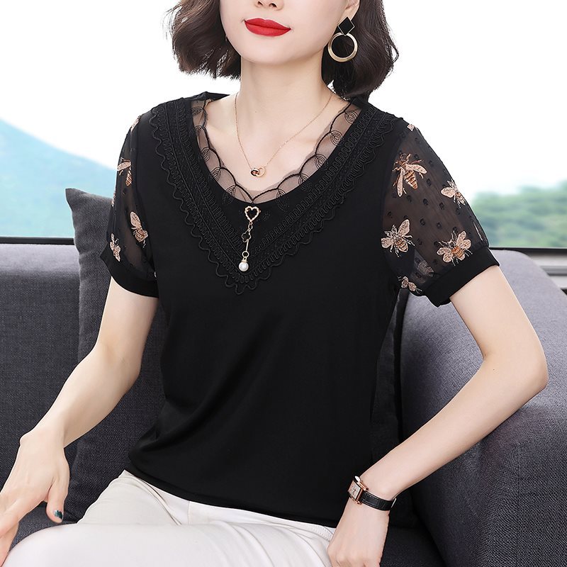 Mother’s 2024 Summer New Short-sleeved T-shirt Women’s Belly Covering Fashionable Upper Clothes for Middle-aged and Elderly Western Style Chiffon Small Shirt