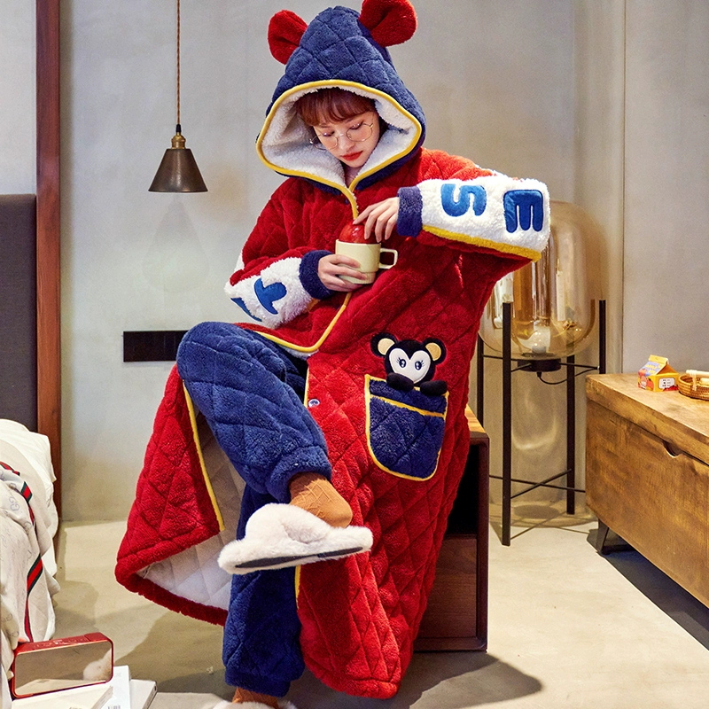 pink grape coral velvet pajamas for women in autumn and winter plus velvet thickened three-layer cotton to keep warm and can be worn outside home clothes