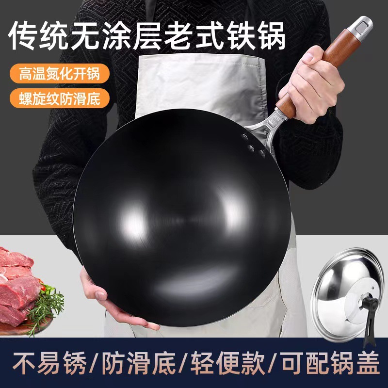 KBQ1 traditional second generation uncoated nitrided wok round bottom pure iron pan non-stick pan household wok induction cooker burning