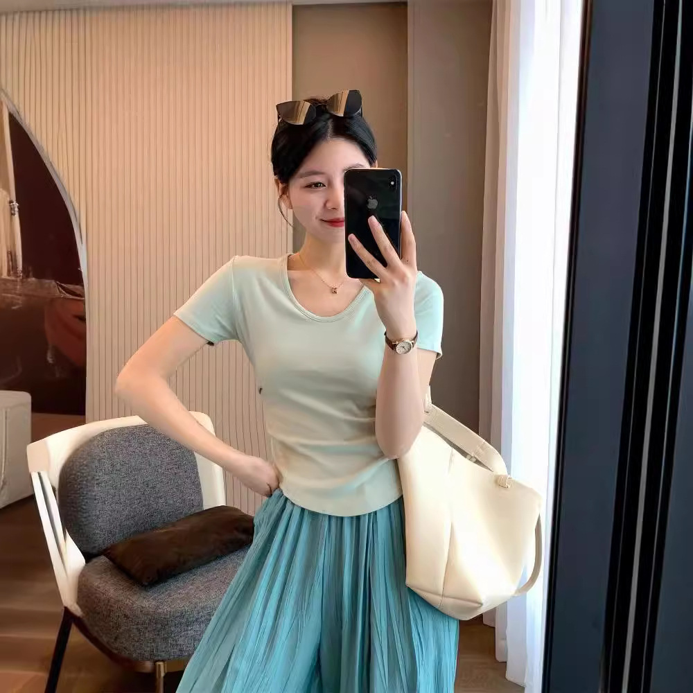 [C1007] New Design Sense U-Neck Backing Shirt Women’s Solid Color Summer Short Sleeve T-Shirt Short Spice Girls Jacket