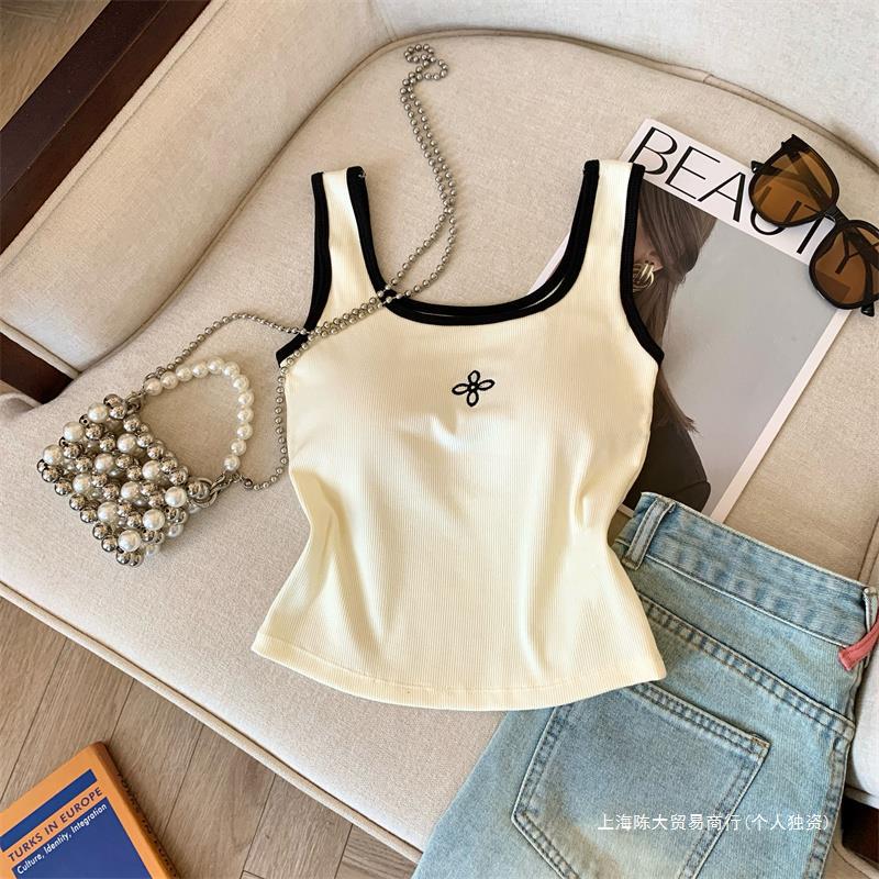 New Season Pure Desire Style Short Top with Spice Girl Small Embroidered Chest Pad with Square Collar Camisole Vest Women’s Summer Collision CD