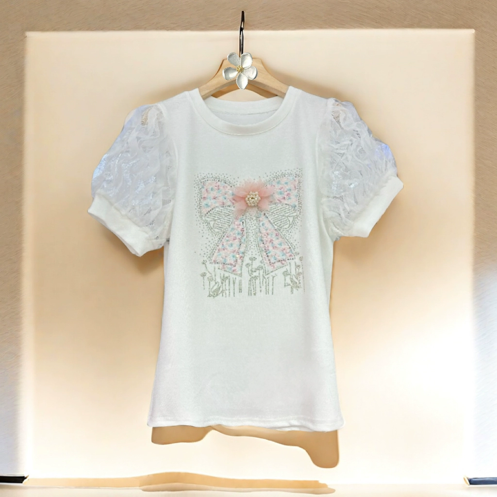 2024 summer new short-sleeved top T-shirt heavy industry bow ironing lace splicing casual versatile sweet ins