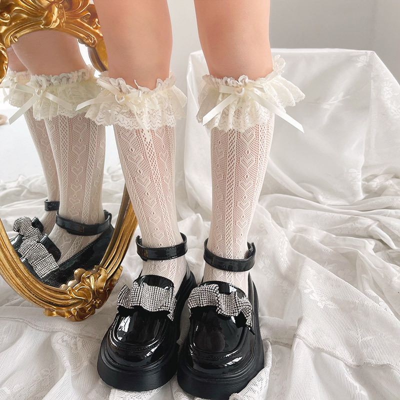 hotmoon Japanese Style New Love Bow Beads Female Children Baby Cute Lace Mid-tube Stacked Socks