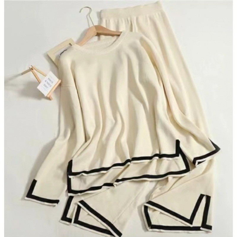 2024 autumn new temperament contrast color split long sleeve sweater high waist slim wide leg pants pants two-piece suit