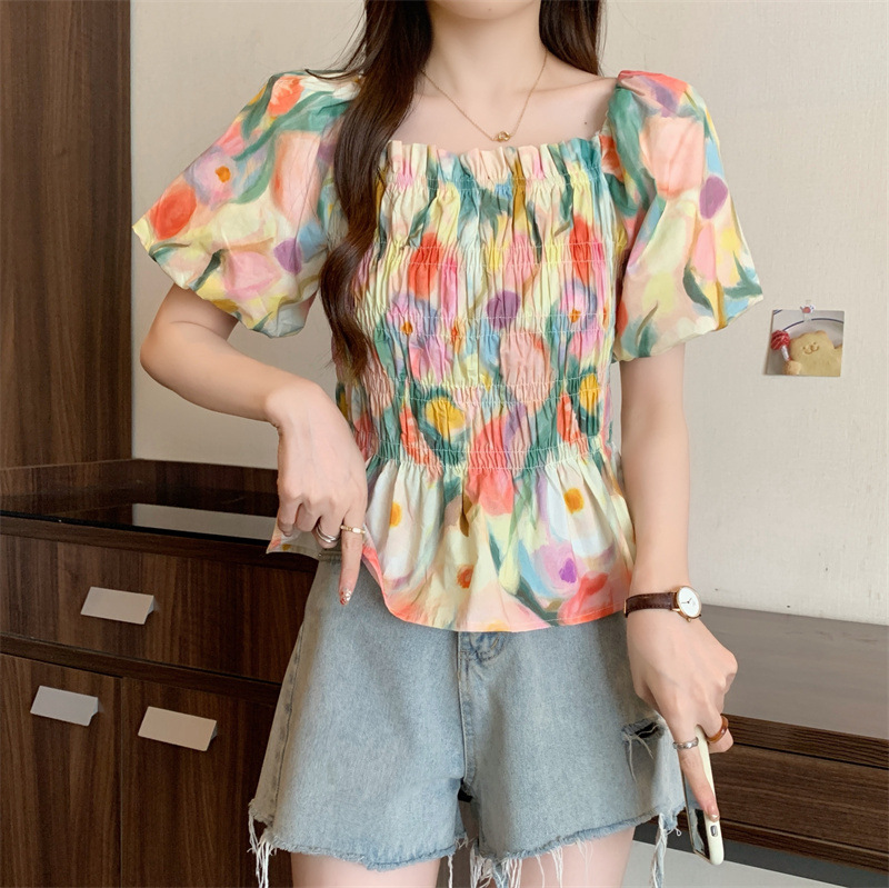 Real shot 2024 plus size women’s in stock square collar pleated waist slimming printed short sleeve shirt floral shirt women’s summer